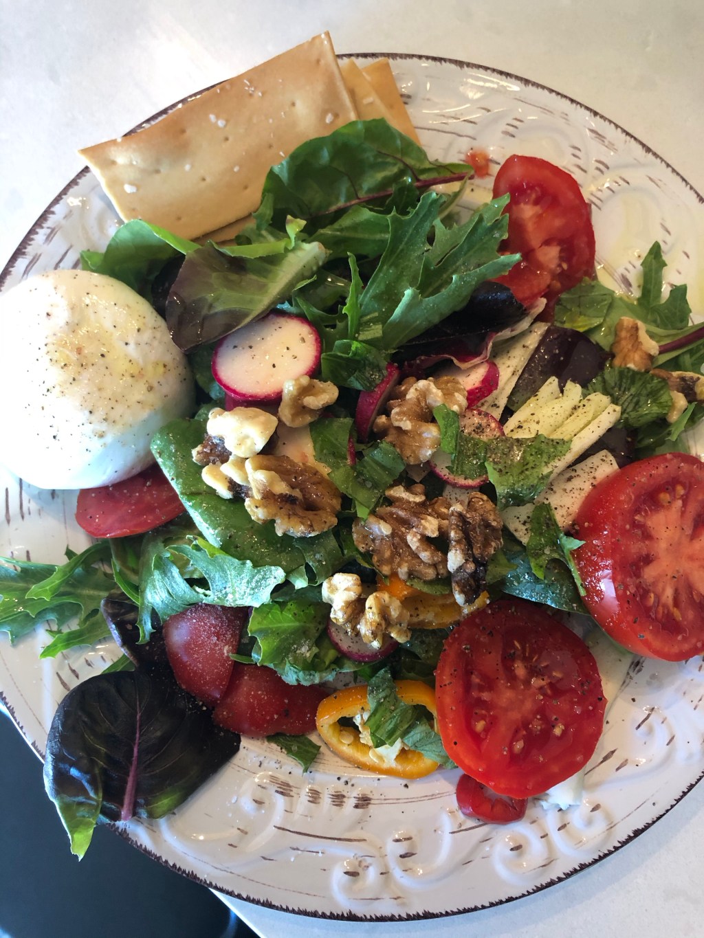 Lunch: Large green salad with tomatoes, cucumber, walnuts, feta cheese, olive oil, lemon, and leftover salmon from the night before. Slice of homemade bread. Small piece of chocolate. Water.