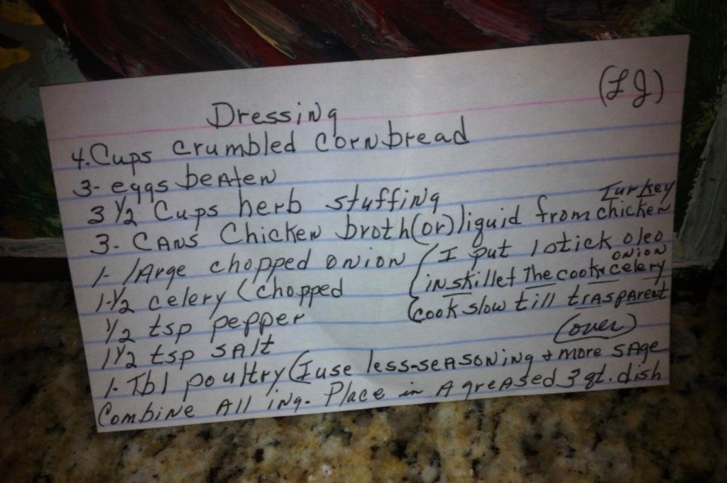 This is THE DRESSING recipe. My gift to you via my Nana who passed away several years ago but not before writing this down in her neat grandmama penmanship. This is DRESSING, not stuffing. It does not go in the bird. Don’t come at me with stuffing under any circumstances because it is disgusting and un-Southern.